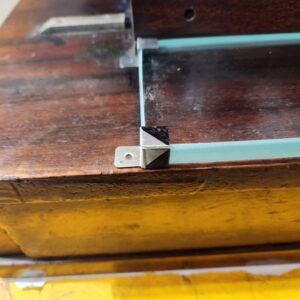 Originally, this cash register had a central hole for mounting the milk-glass. However, a central hole in the new glass would have shattered the glass coin plate. Instead, I added newly fabricated corner brackets painted to match the wood and glass.