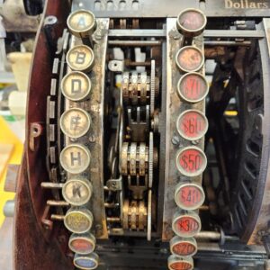 The cash register had a nameplate displaying the workers’ names and lettered keys corresponding to those names, all of which needed cleaning.